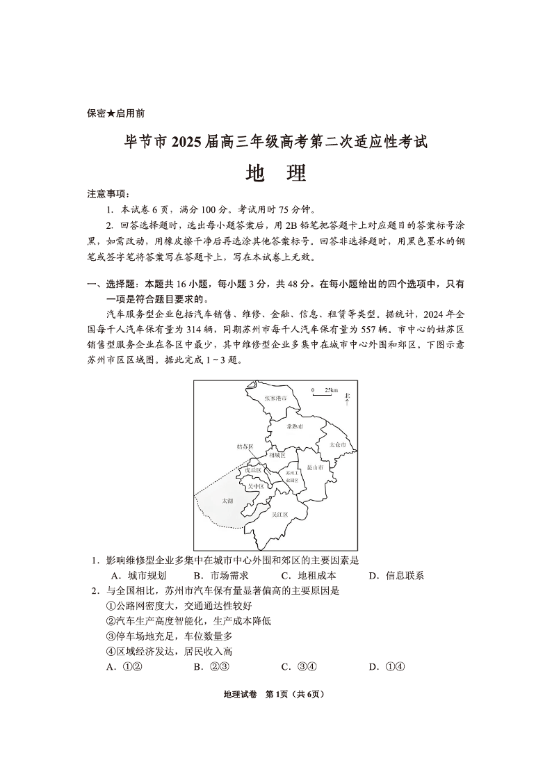 毕节市2025届高三年级高考第二次适应性考试 地理.pdf