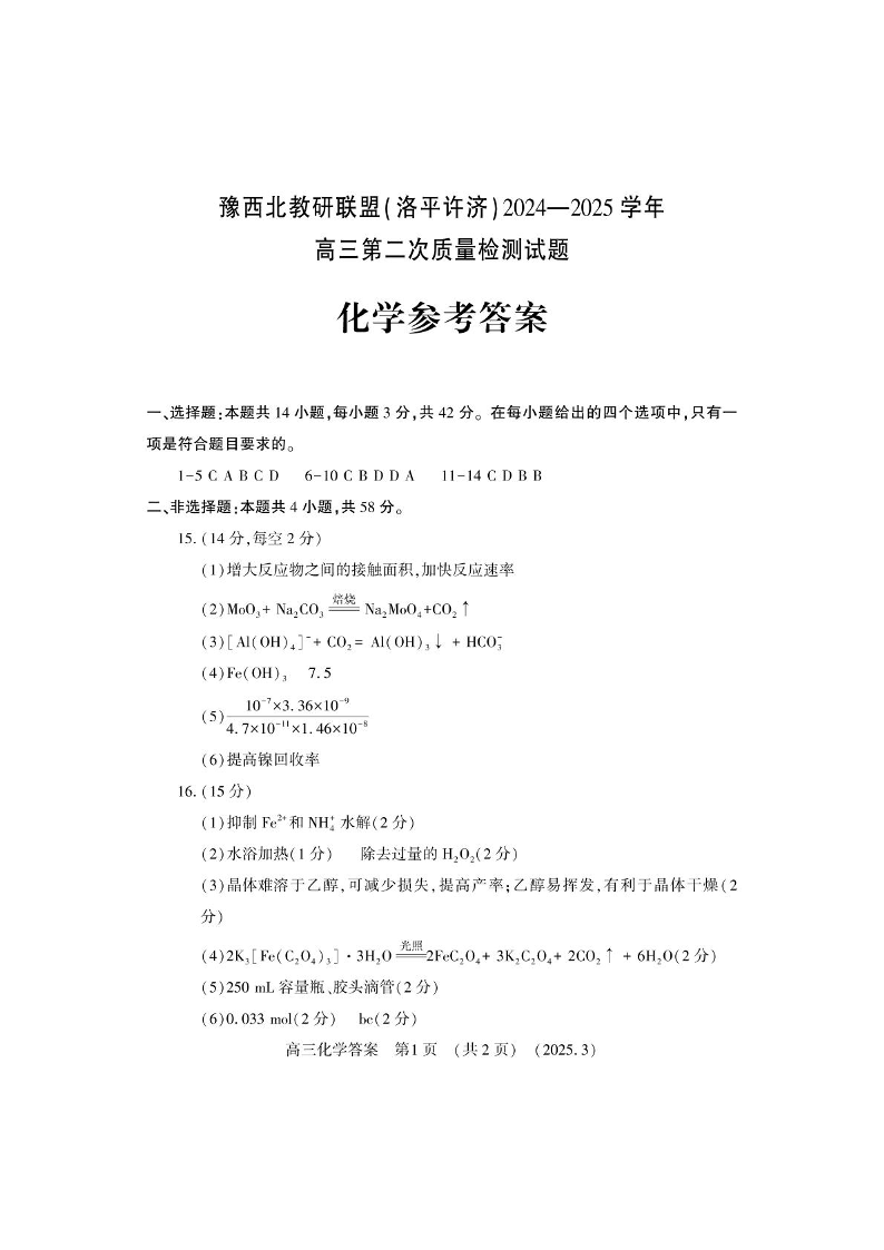 河南省豫西北教研联盟(洛平许济)2025届高三第二次质量检测 化学答案.pdf
