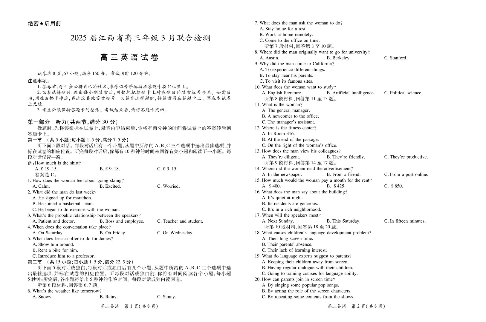 江西省上进联考2024-2025学年高三下学期3月联合检测 英语(含答案).pdf