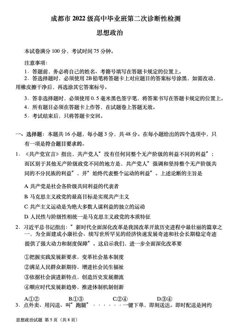 成都市2022级高中毕业班第二次诊断性检测 政治.pdf