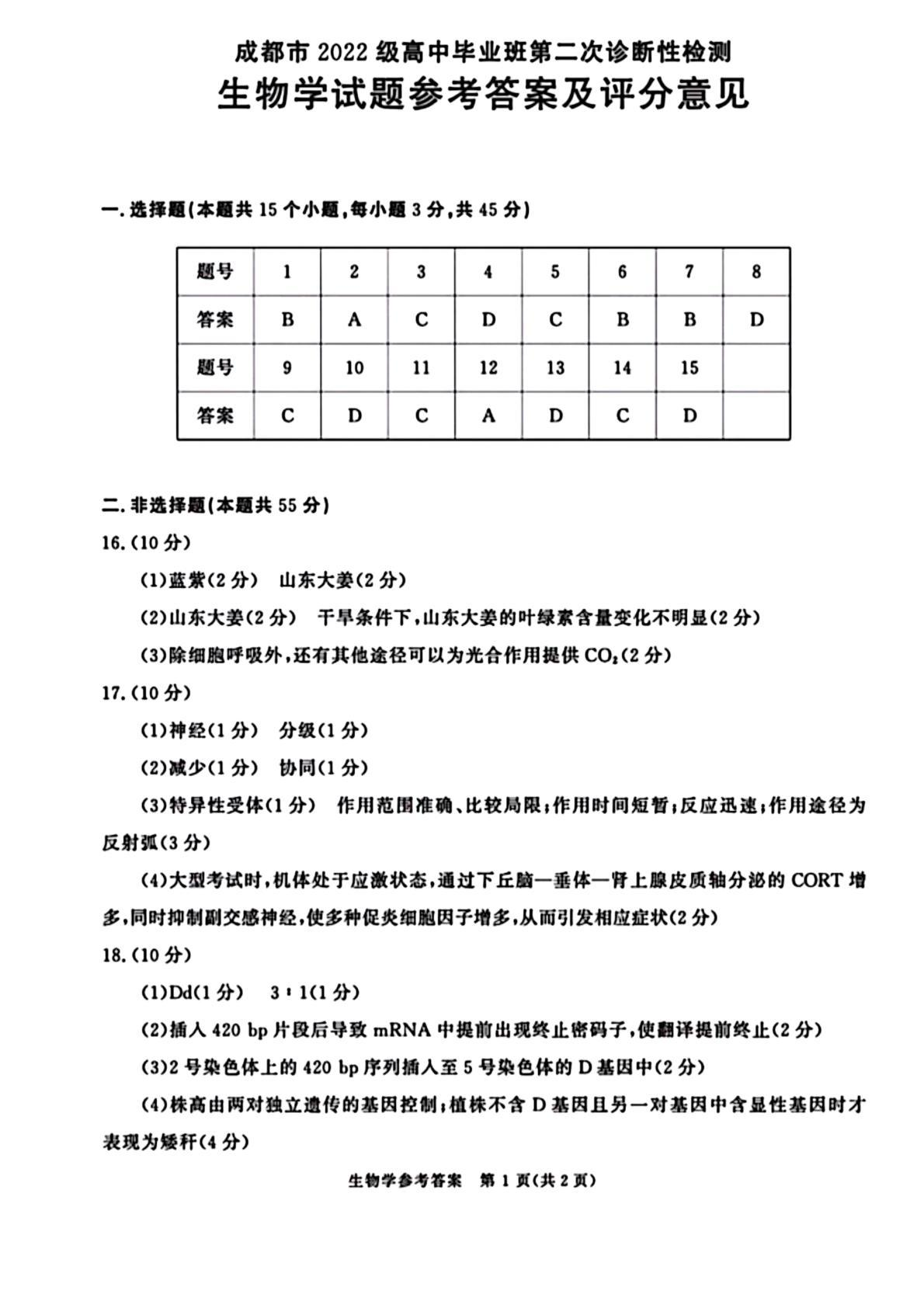 成都市2022级高中毕业班第二次诊断性检测 生物答案.pdf