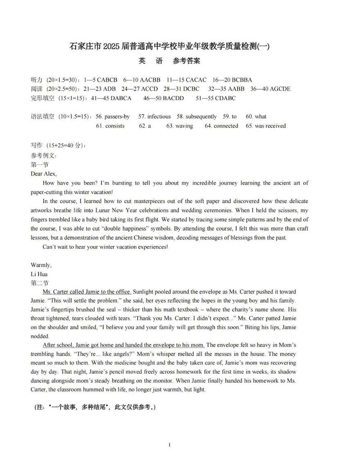 石家庄市2025届普通高中毕业年级教学质量检测(一)英语答案.pdf