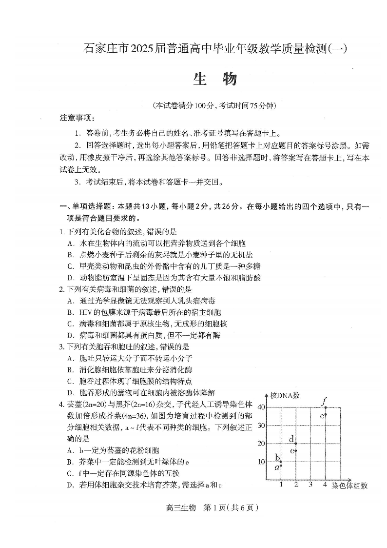石家庄市2025届普通高中毕业年级教学质量检测(一)生物.pdf