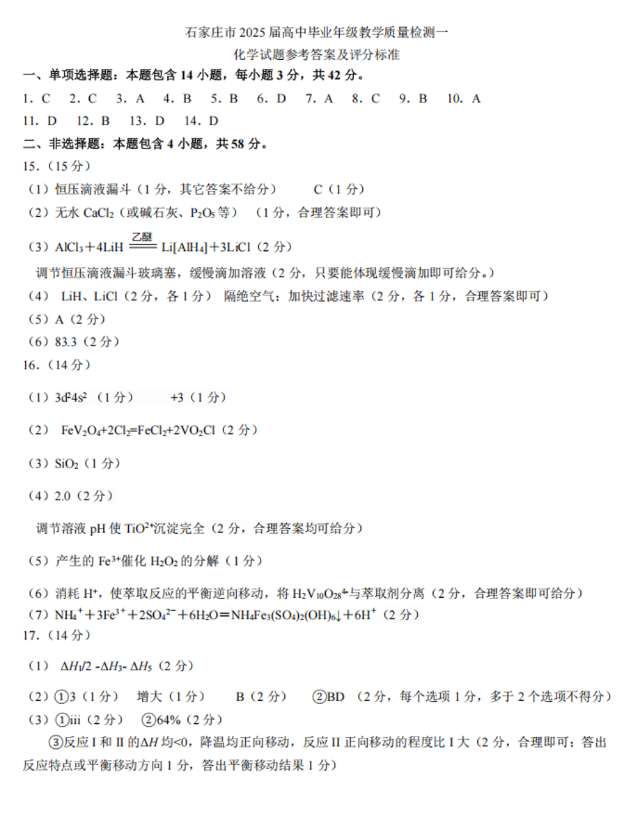 石家庄市2025届普通高中毕业年级教学质量检测(一)化学答案.pdf