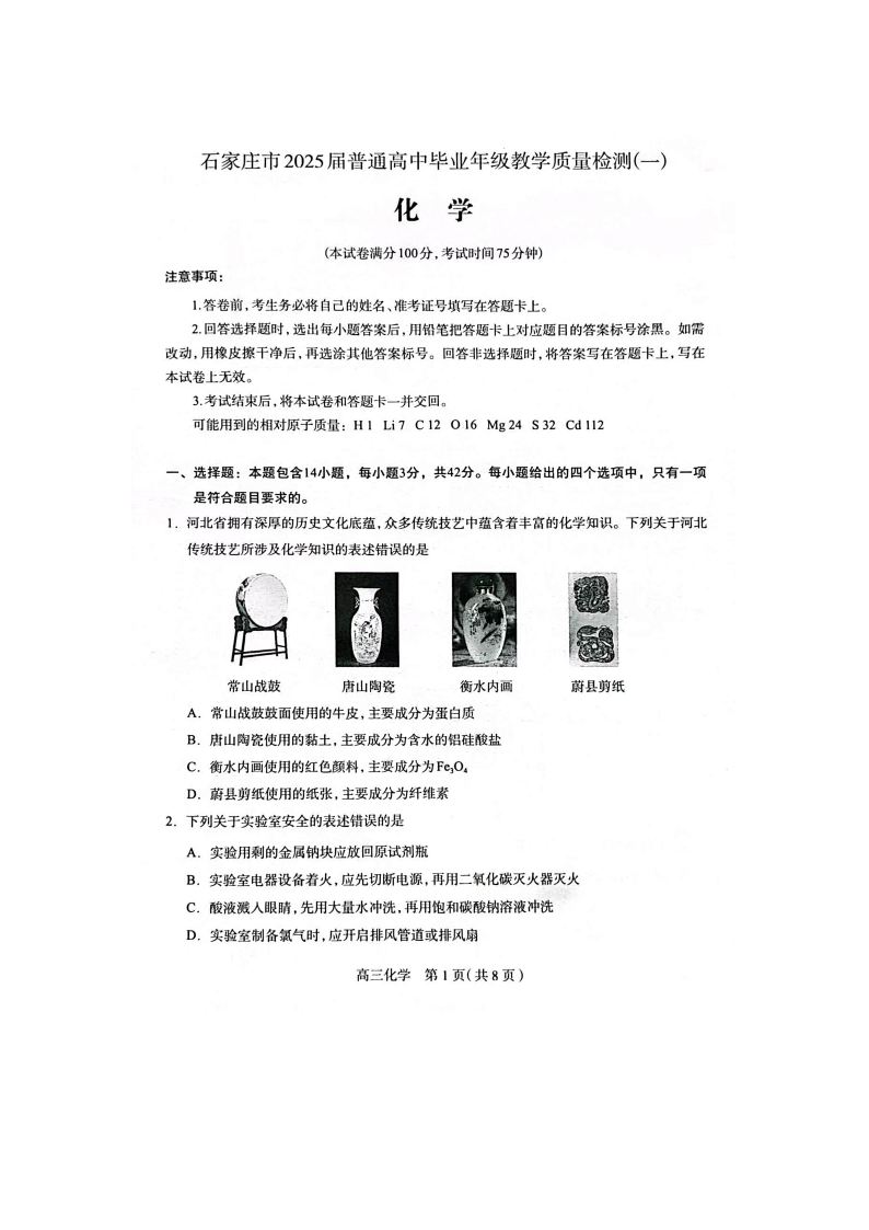 石家庄市2025届普通高中毕业年级教学质量检测(一)化学.pdf