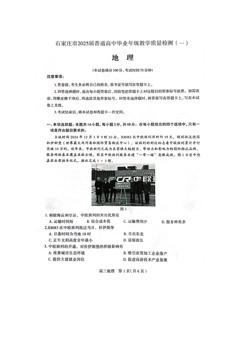 石家庄市2025届普通高中毕业年级教学质量检测(一)地理.pdf