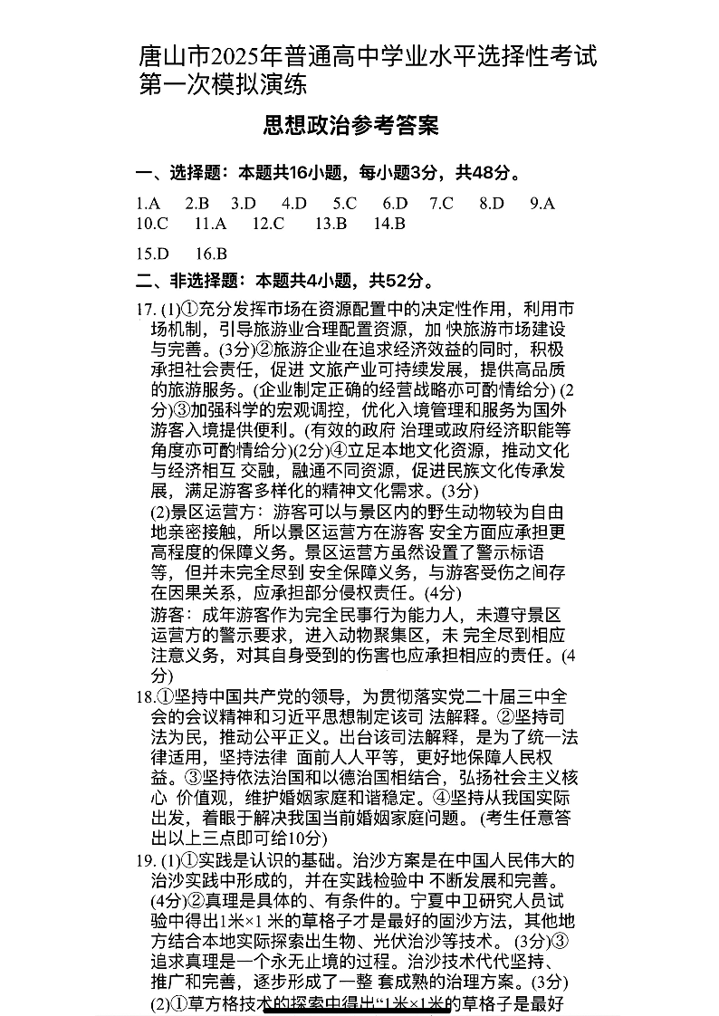 唐山市2025年普通高等院校招生第一次模拟演练 政治答案.pdf