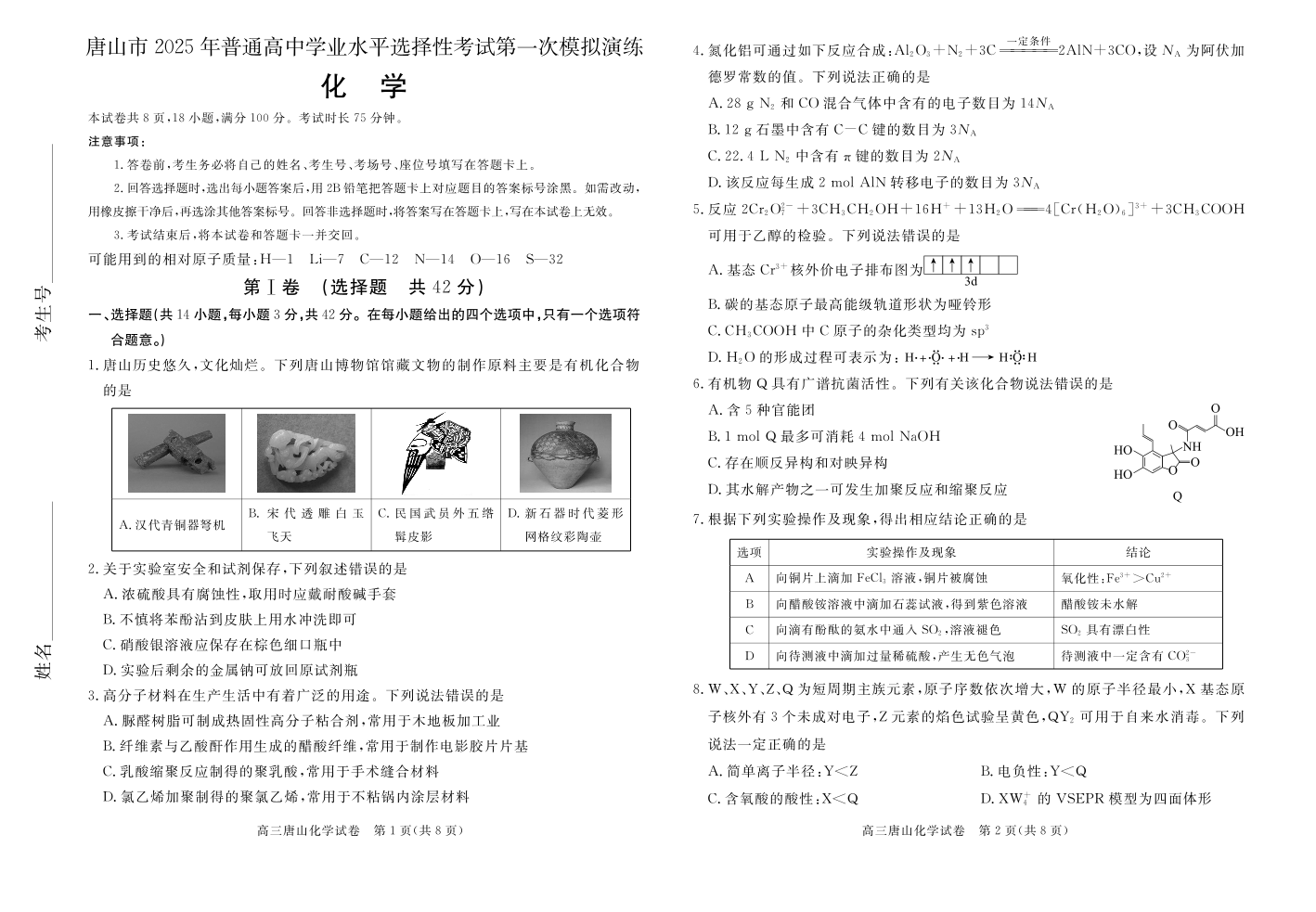 唐山市2025年普通高等院校招生第一次模拟演练 化学.pdf