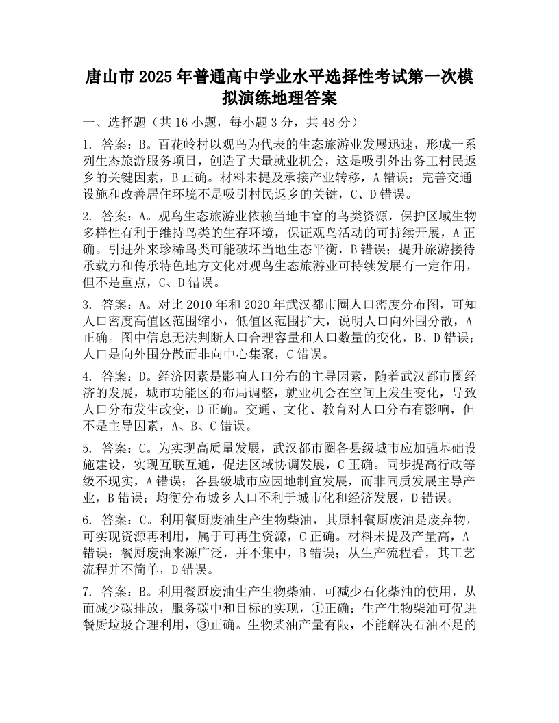 唐山市2025年普通高等院校招生第一次模拟演练 地理答案.pdf