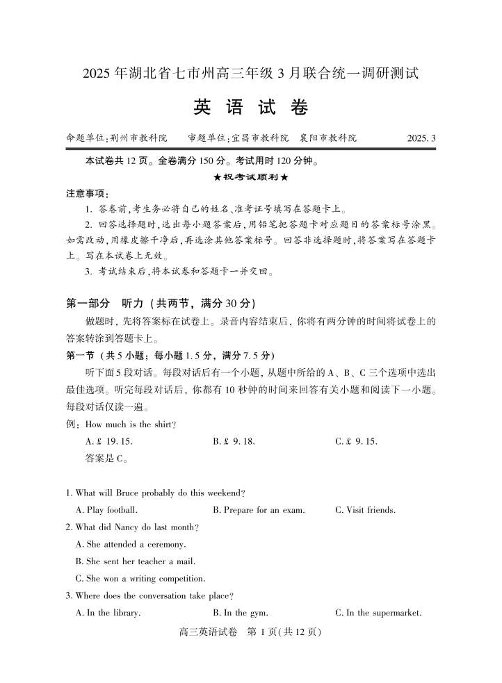 2025年湖北省七市州高三年级3月联合统一调研测试 英语.pdf