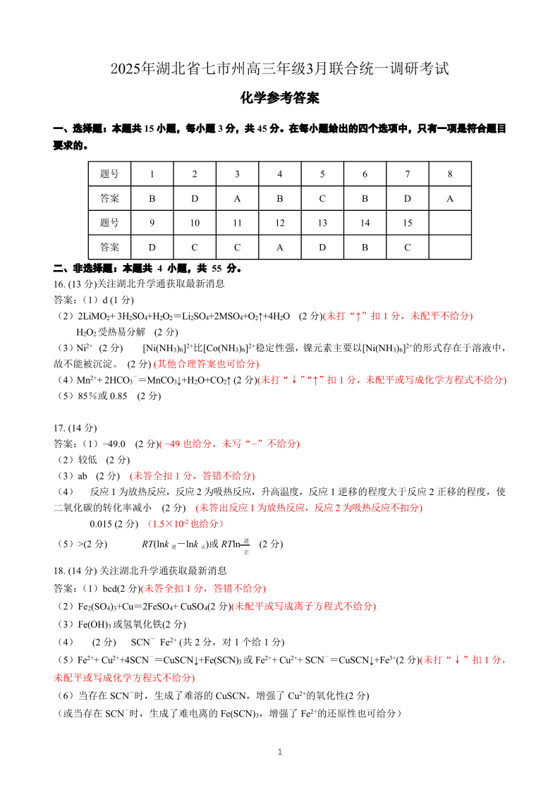 2025年湖北省七市州高三年级3月联合统一调研测试 化学答案.pdf