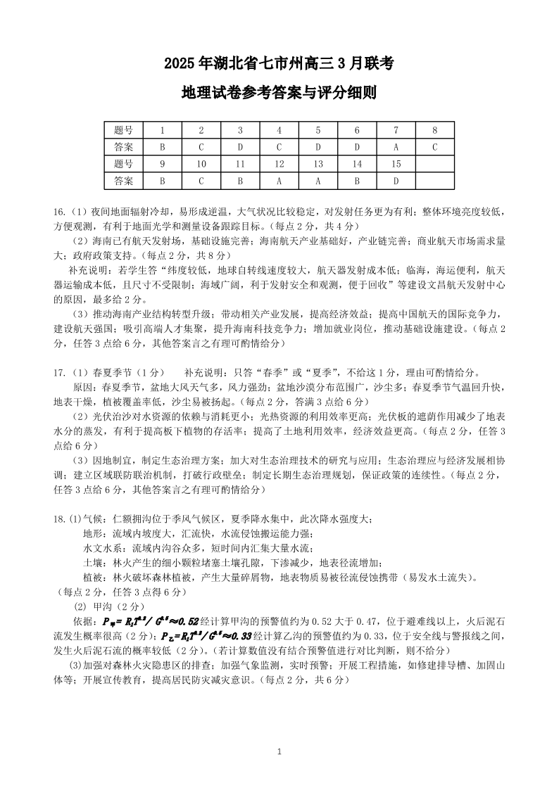 2025年湖北省七市州高三年级3月联合统一调研测试 地理答案.pdf