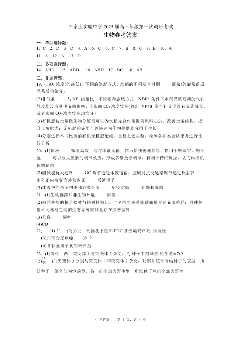 河北省石家庄实验中学2025届高三年级第一次调研考试 生物答案.docx