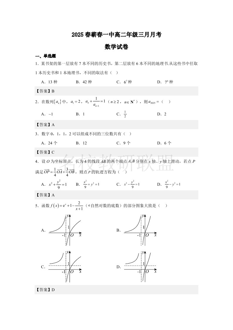 2025年春蕲春一中高二3月月考 数学答案.pdf