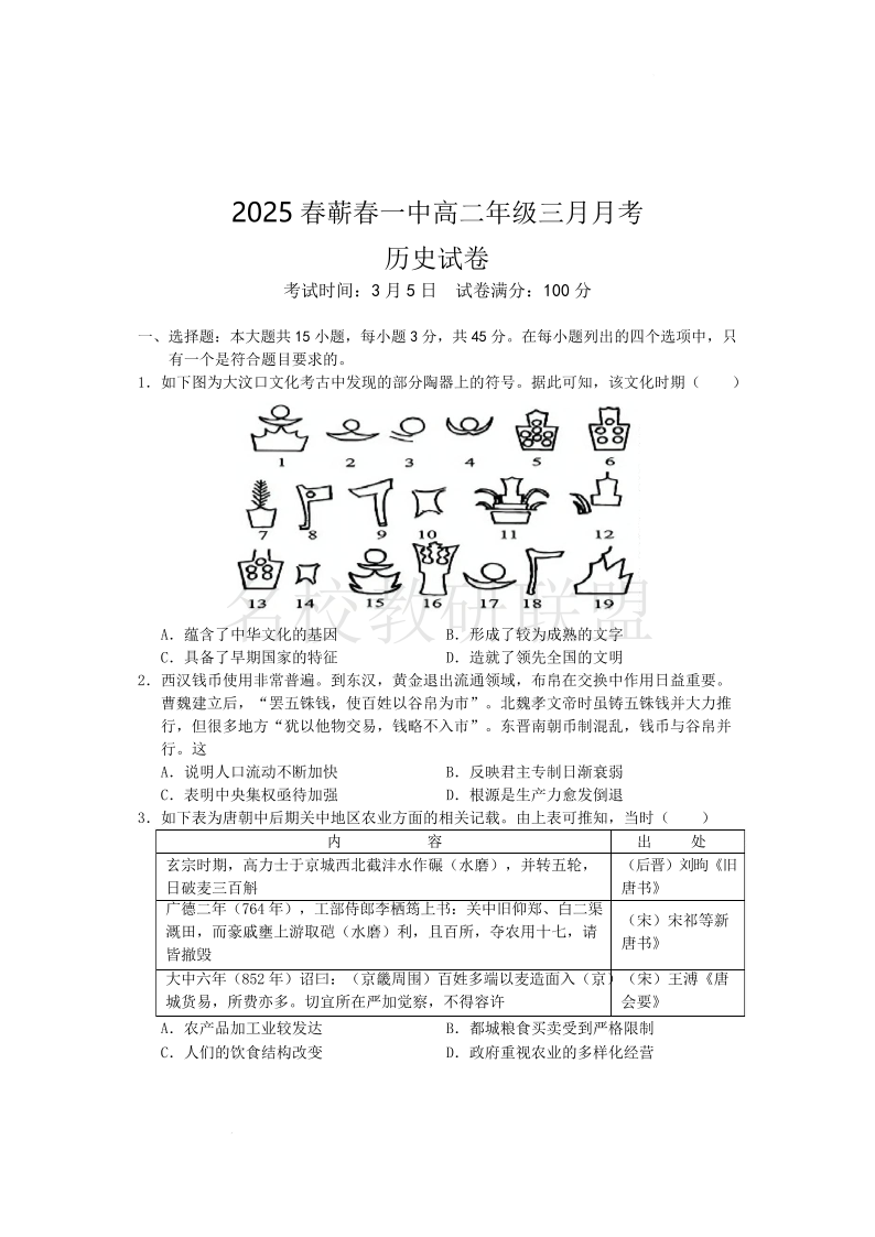 2025年春蕲春一中高二3月月考 历史.pdf