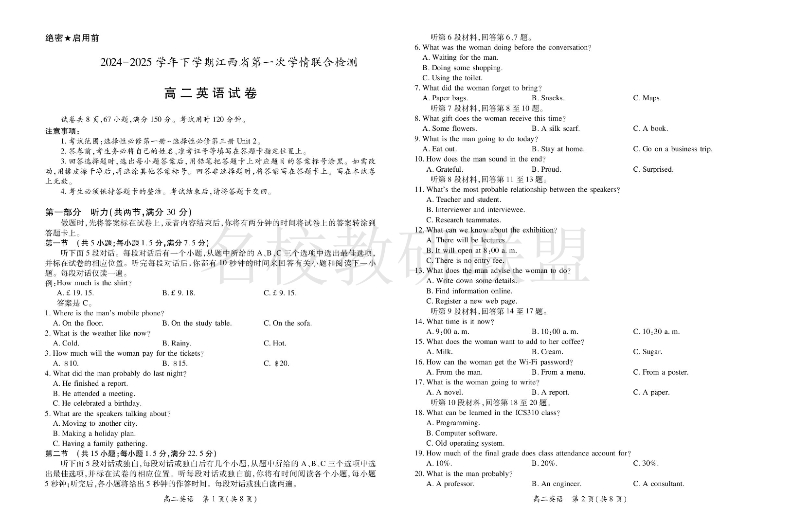 2024-2025学年下学期江西省第一次学情联合检测 英语.pdf