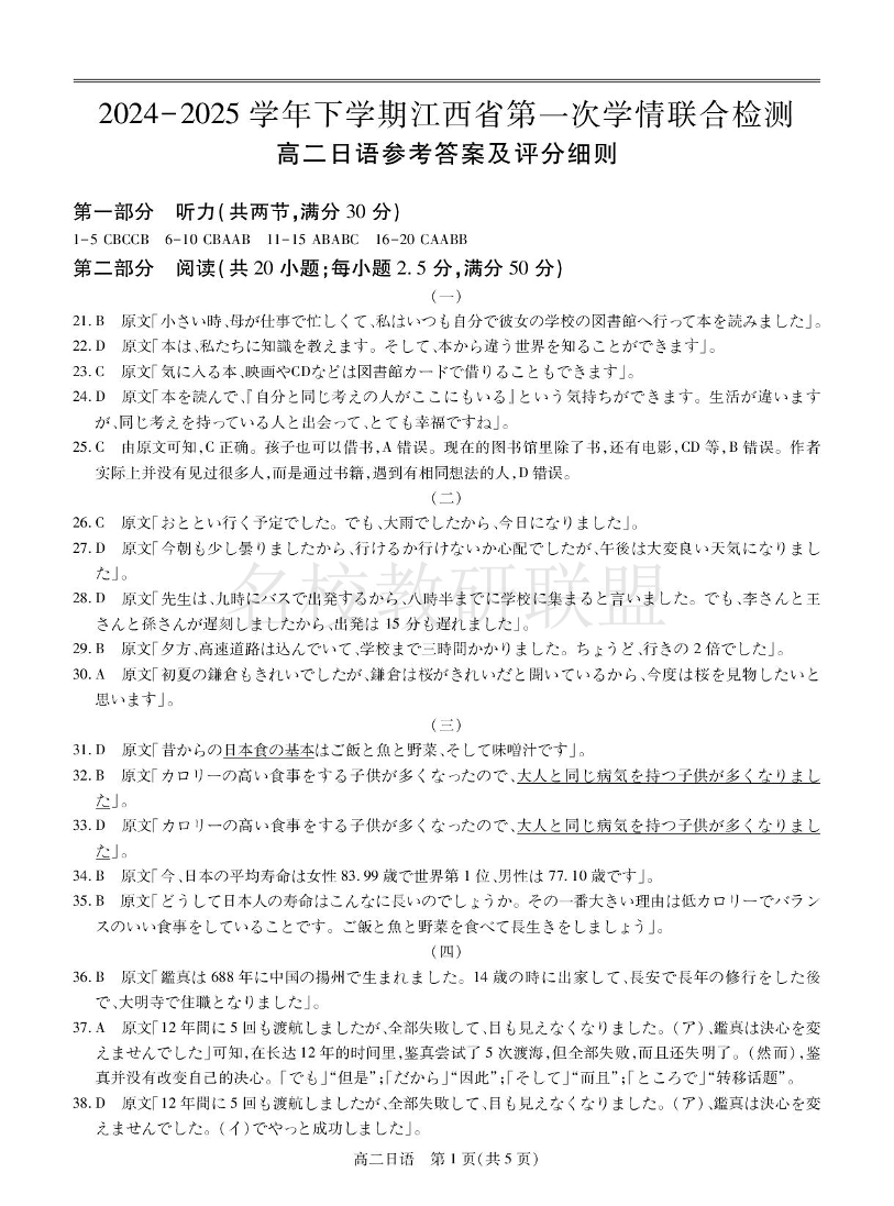 2024-2025学年下学期江西省第一次学情联合检测 日语答案.pdf