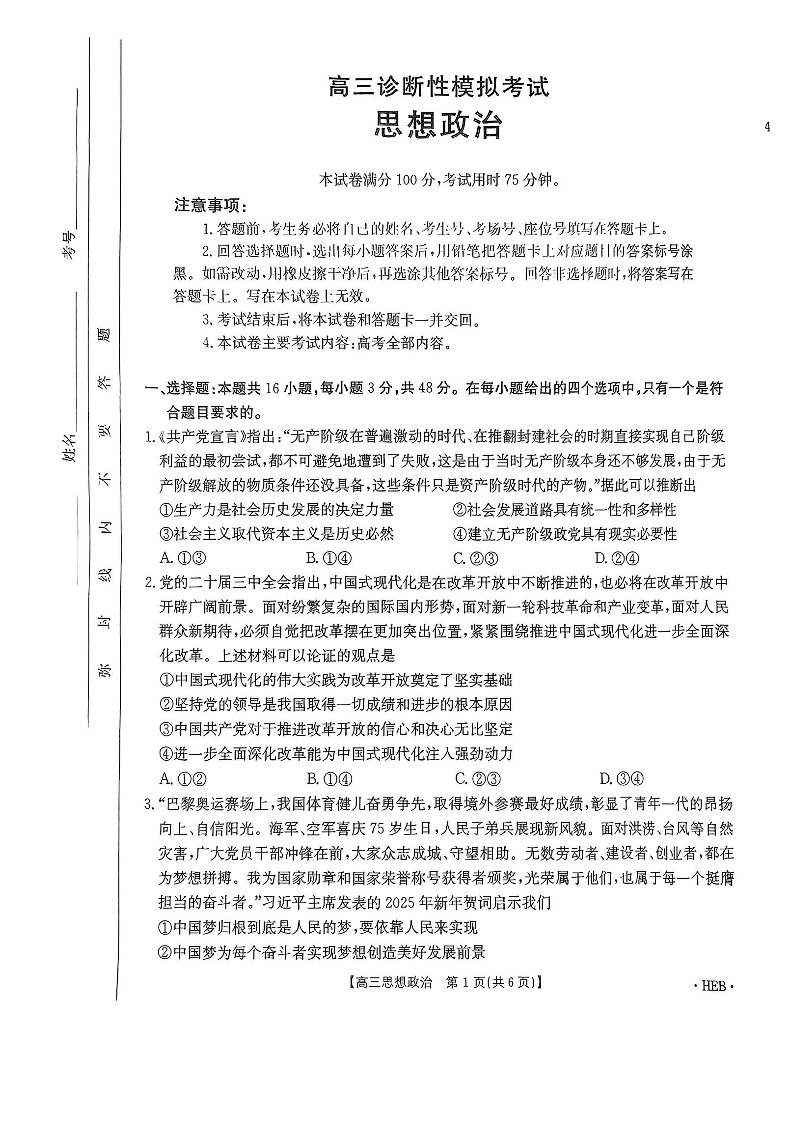 河北省部分学校2025届高三诊断性模拟考试 政治.pdf