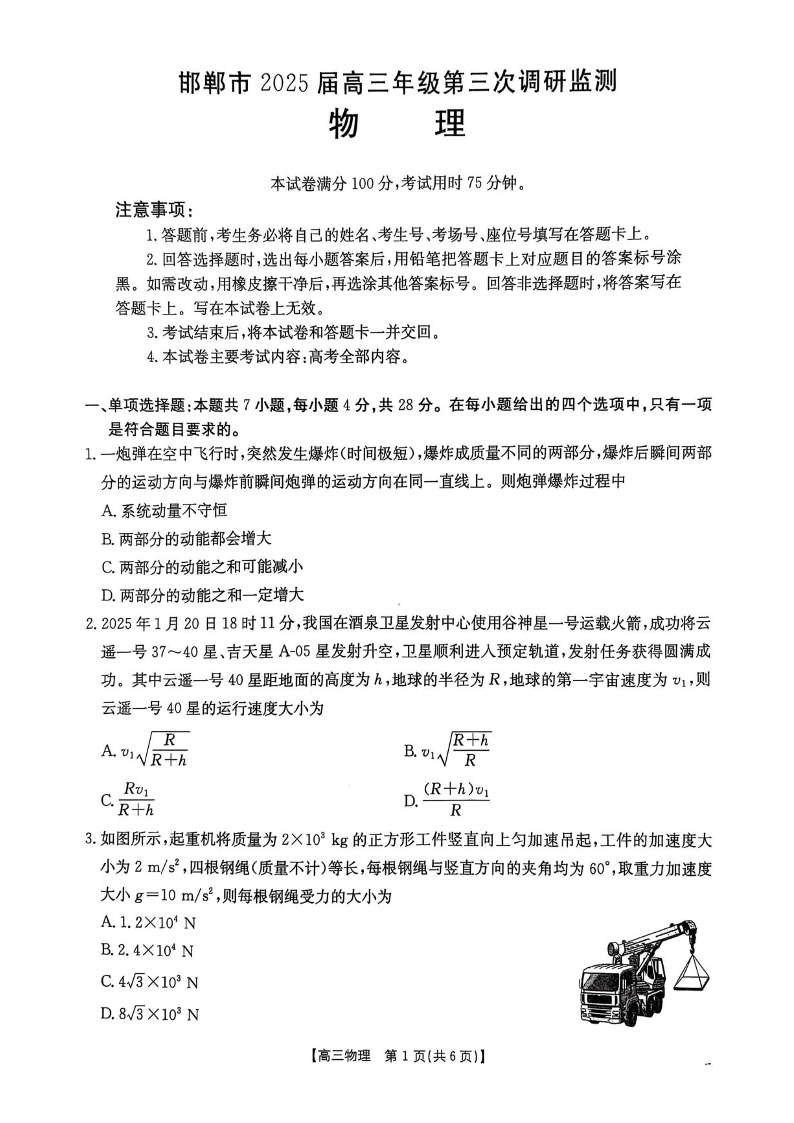 河北省邯郸市2025届高三年级第三次调研监测 物理试卷(含答案).pdf