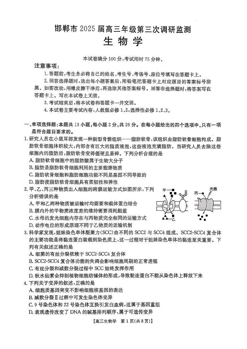 河北省邯郸市2025届高三年级第三次调研监测 生物试卷(含答案).pdf