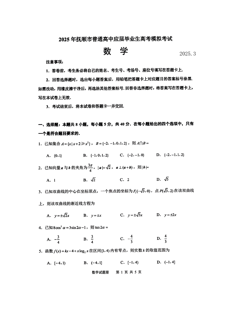 2025年抚顺市普通高中高三3月模拟考试 数学(含答案).pdf