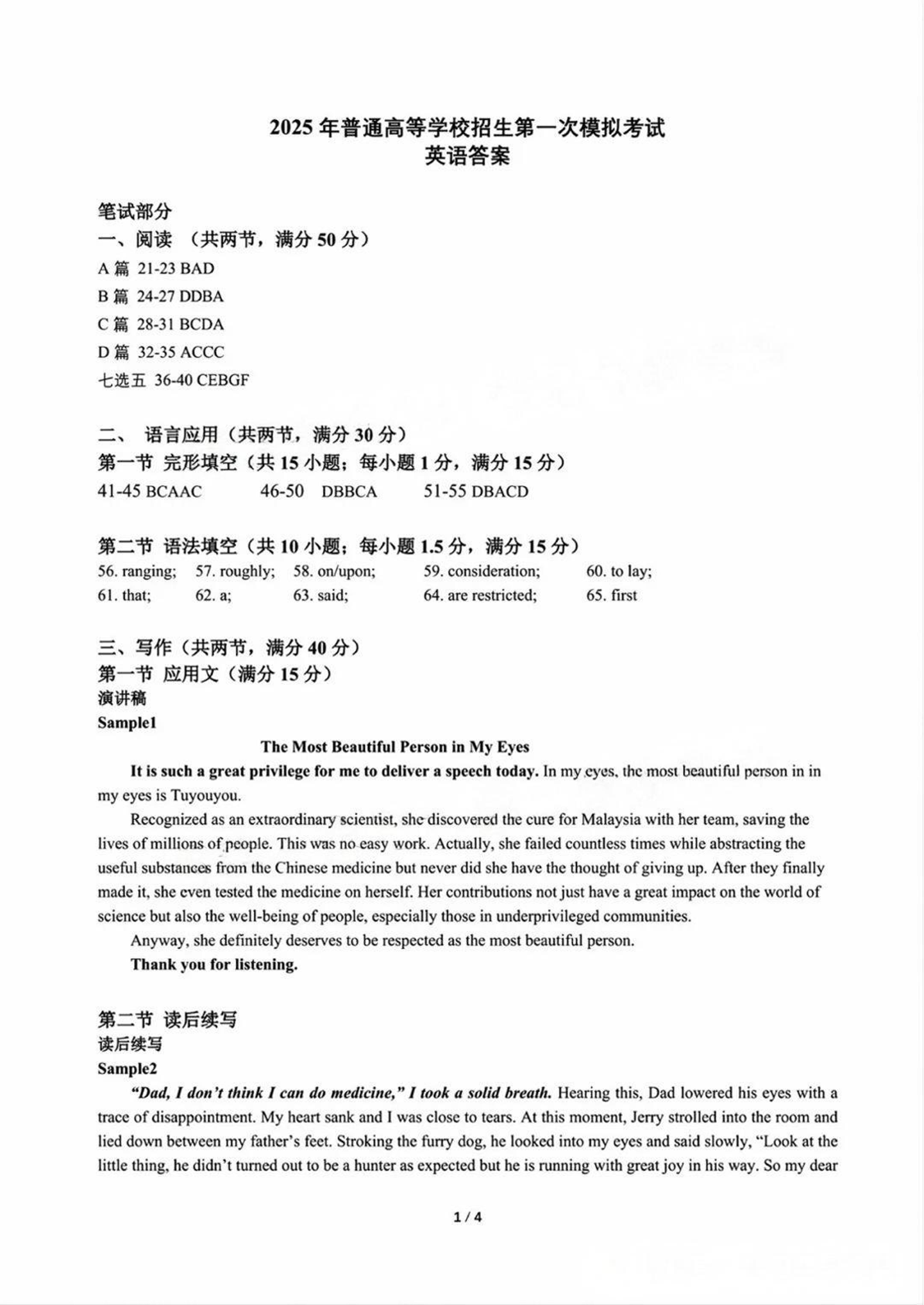内蒙古自治区呼和浩特市2025届高三第一次模拟考试 英语答案.pdf