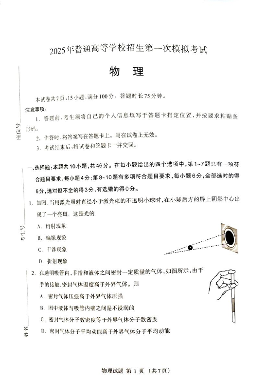 内蒙古自治区呼和浩特市2025届高三第一次模拟考试 物理.pdf