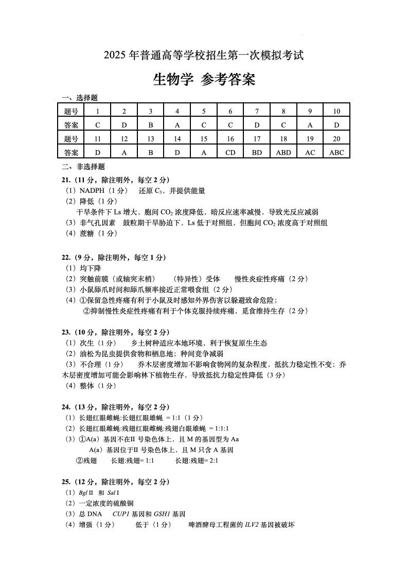 内蒙古自治区呼和浩特市2025届高三第一次模拟考试 生物答案.pdf