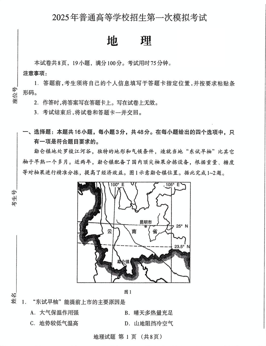 内蒙古自治区呼和浩特市2025届高三第一次模拟考试 地理.pdf