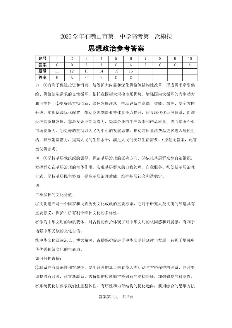石嘴山市第一中学2025学年高三年级高考第一次模拟 政治答案.docx