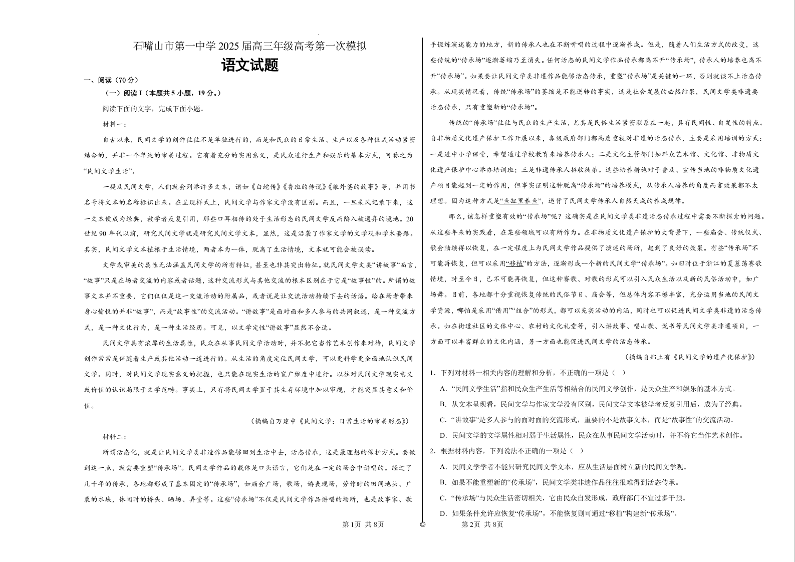石嘴山市第一中学2025学年高三年级高考第一次模拟 语文.docx