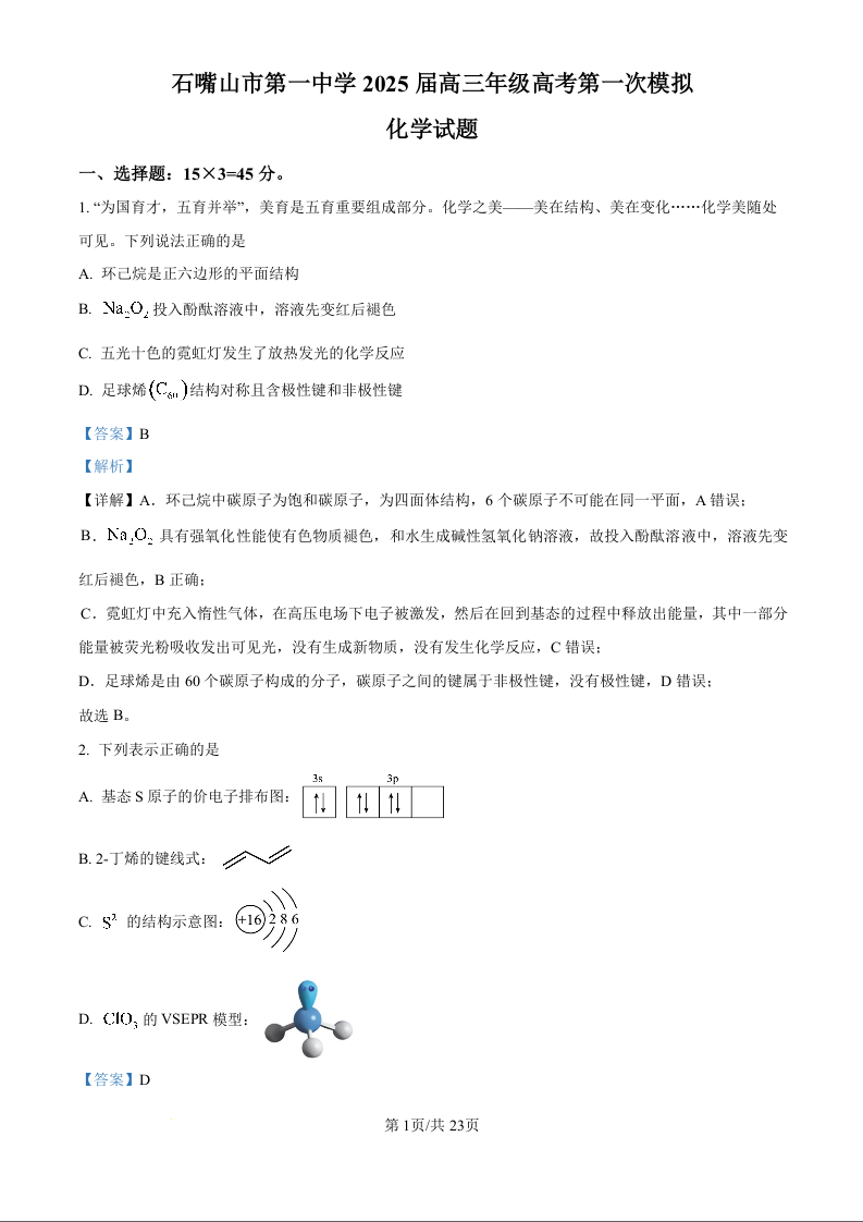 石嘴山市第一中学2025学年高三年级高考第一次模拟 化学答案.docx