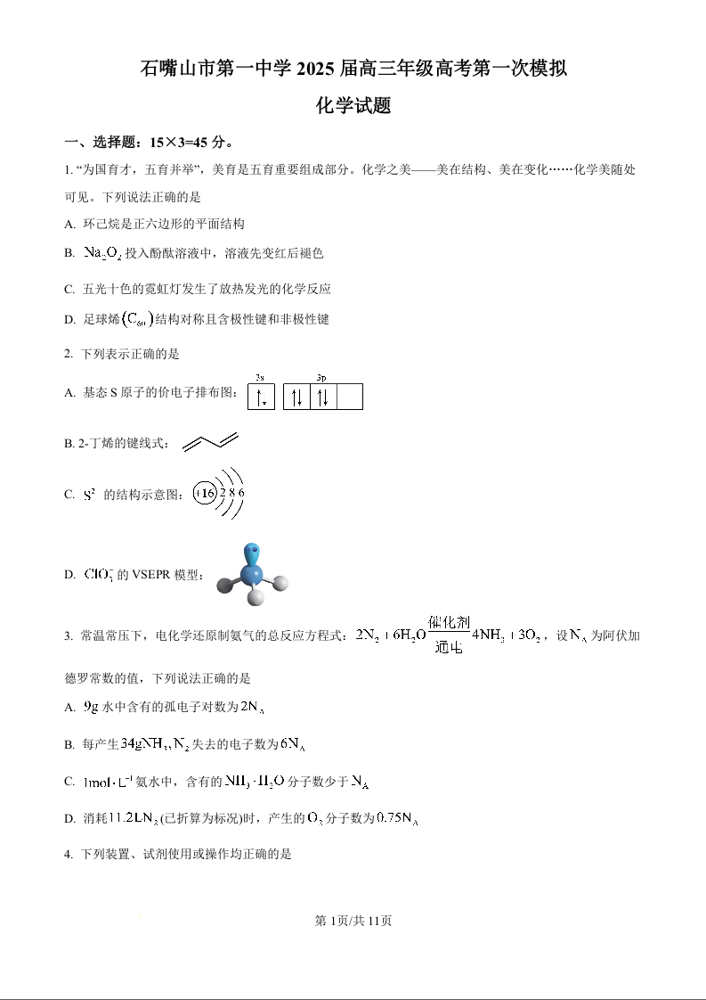 石嘴山市第一中学2025学年高三年级高考第一次模拟 化学.docx