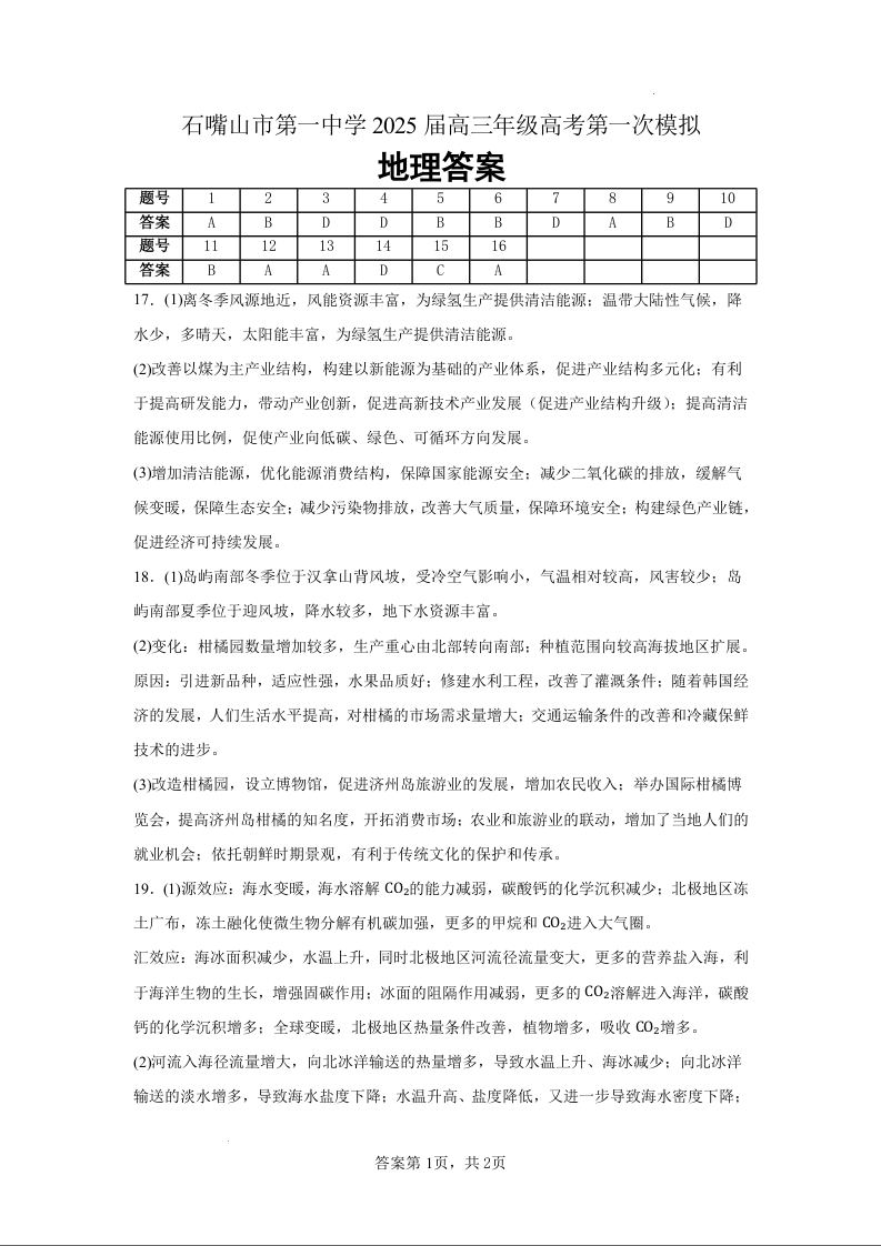 石嘴山市第一中学2025学年高三年级高考第一次模拟 地理答案.docx