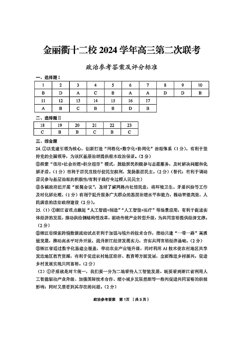 金丽衢十二校2025届高三第二次联考 政治答案.pdf