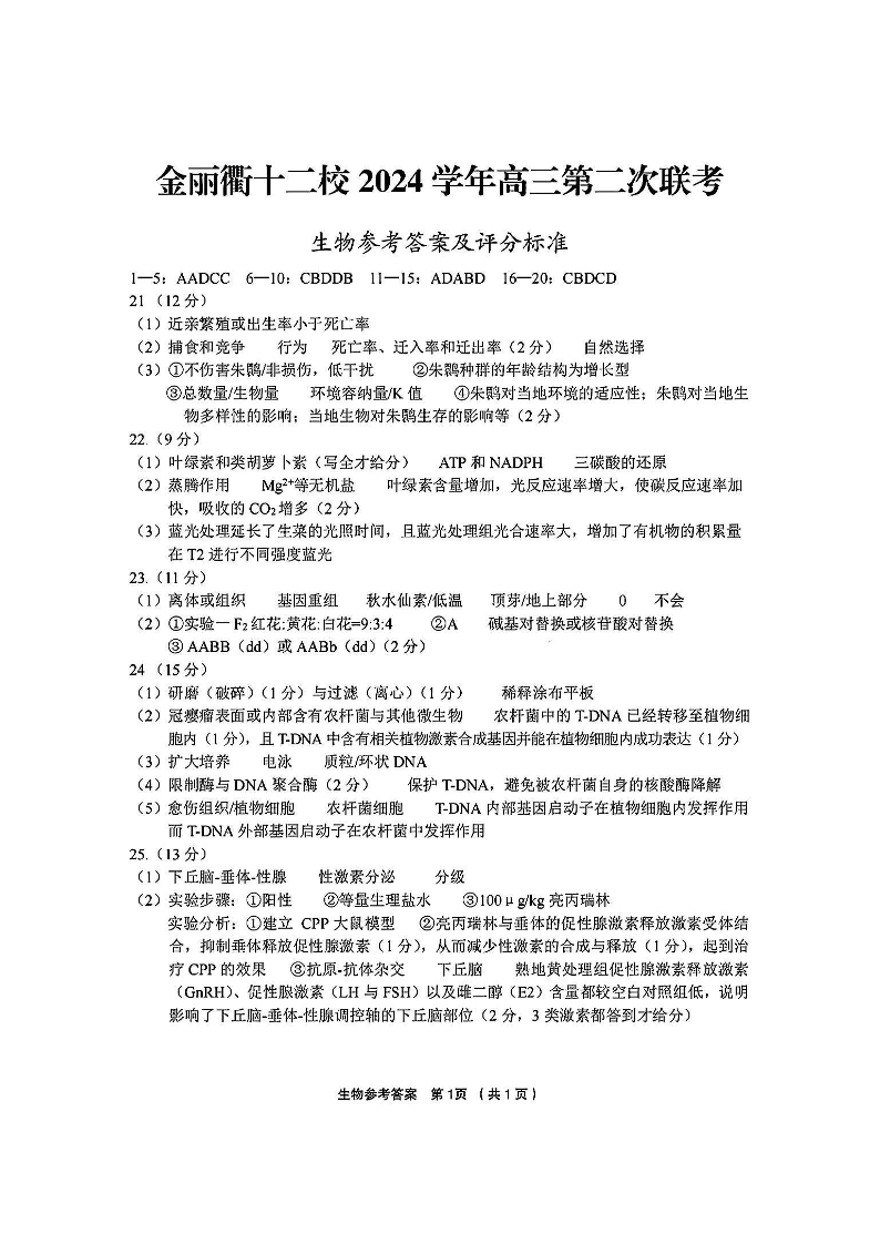 金丽衢十二校2025届高三第二次联考 生物答案.pdf