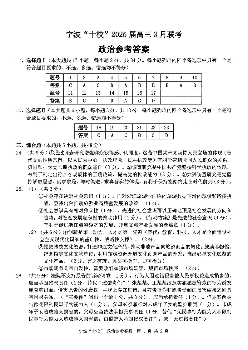 浙江省宁波“十校”2025届高三3月联考 政治答案.pdf