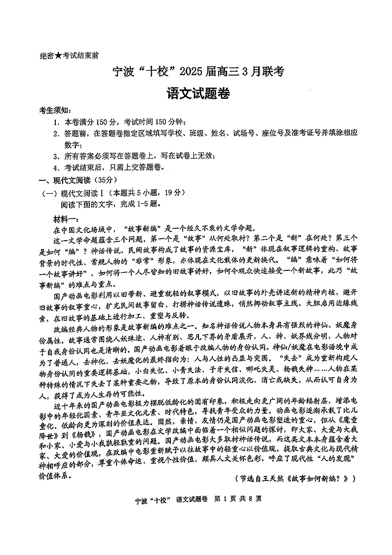 浙江省宁波“十校”2025届高三3月联考 语文.pdf