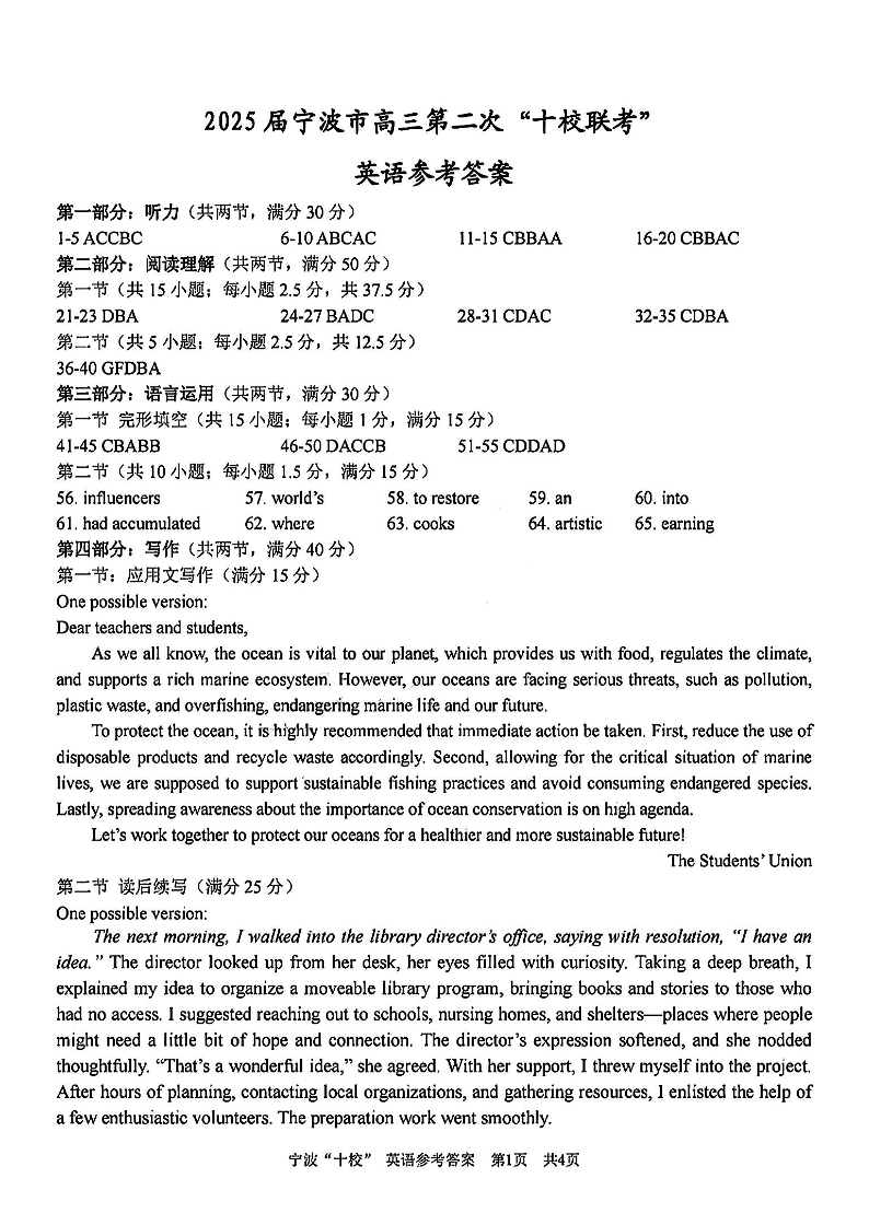 浙江省宁波“十校”2025届高三3月联考 英语答案.pdf