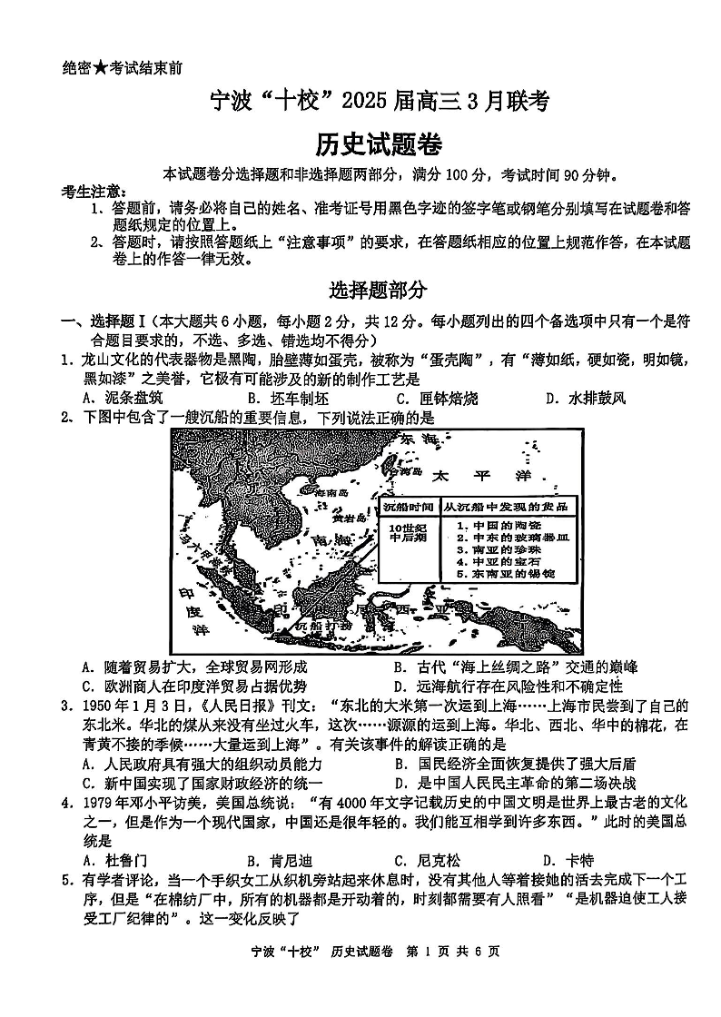 浙江省宁波“十校”2025届高三3月联考 历史.pdf