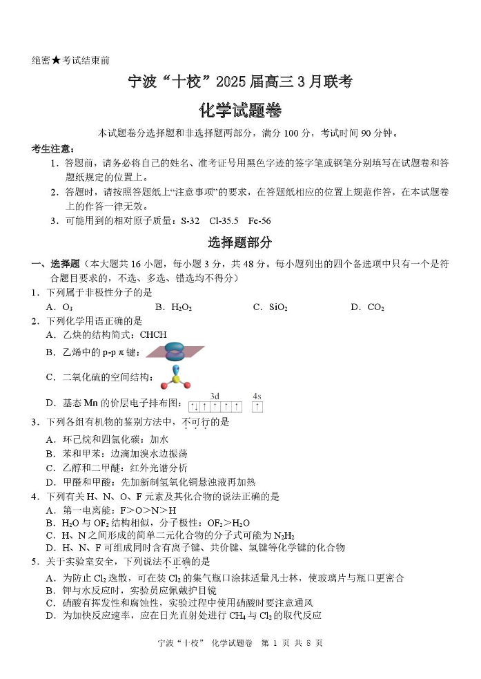 浙江省宁波“十校”2025届高三3月联考 化学.pdf