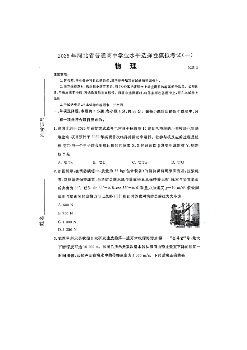 河北省承德、张家口市2025届高三下学期统一模拟考试(一)物理.pdf