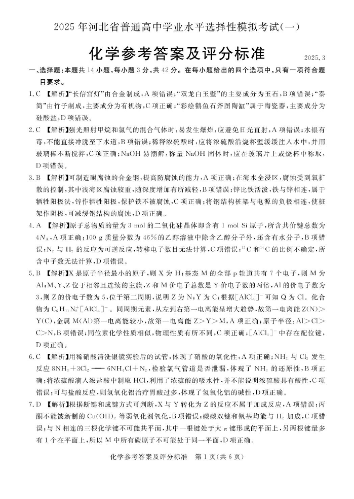 河北省承德、张家口市2025届高三下学期统一模拟考试(一)化学答案.pdf