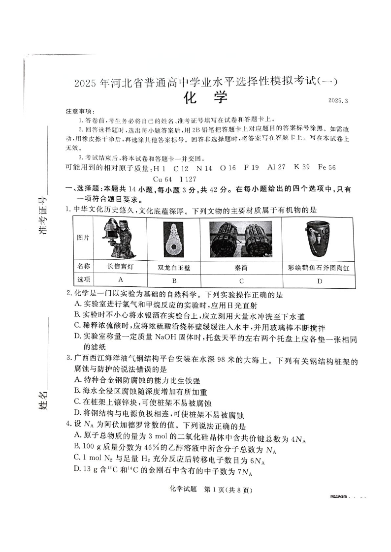 河北省承德、张家口市2025届高三下学期统一模拟考试(一)化学.pdf