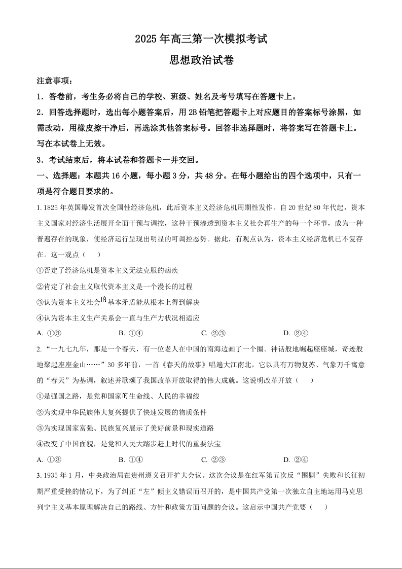 河北省沧州市沧衡八县联考2025年高三第一次模拟考试 政治(含答案).docx