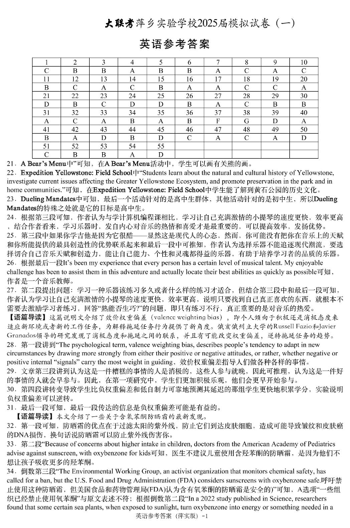 江西省萍乡实验学校2025届高三模拟试卷(一)英语答案.pdf