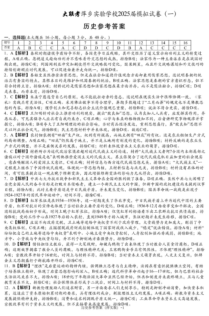 江西省萍乡实验学校2025届高三模拟试卷(一)历史答案.pdf