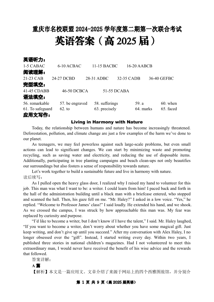 重庆市名校联盟2024-2025学年度第二期第一次联合考试 英语答案.pdf