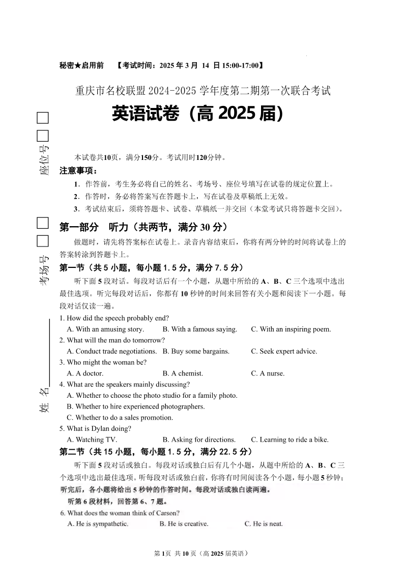 重庆市名校联盟2024-2025学年度第二期第一次联合考试 英语.pdf
