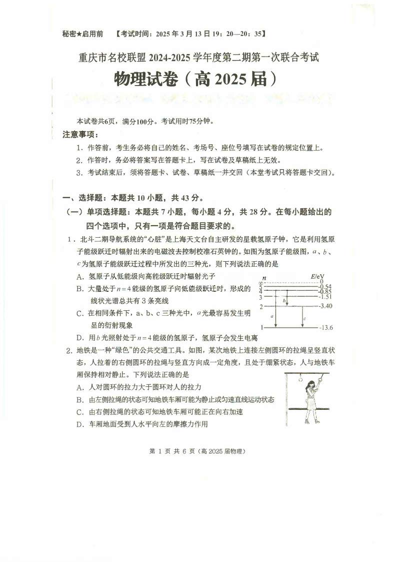 重庆市名校联盟2024-2025学年度第二期第一次联合考试 物理.pdf